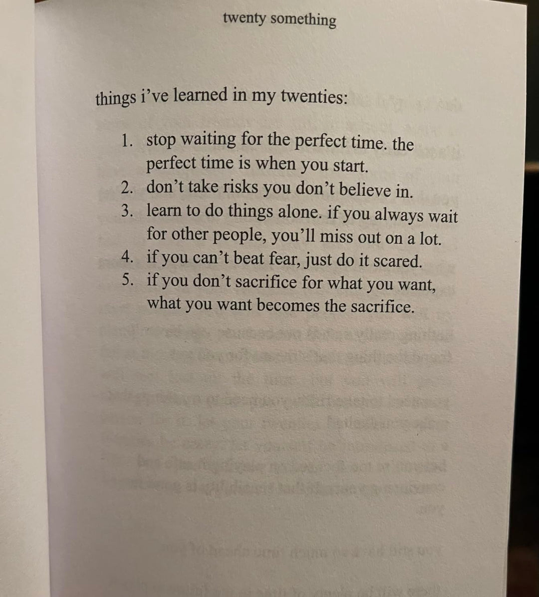 Definitely Wish every last 20 year old would read this, I think things would be a bit easier, just to know you aren’t in this battle alone. While I read this book in less than a week, I still loved it all the same because it’s such a powerful book. Ironically I’m 22 at the moment lost as hell, overwhelmed with work, family drama, just life in general turned around so quickly for me and it’s hard to process how fast things are happening and all at once at that. This book is inspiring and a great eye opener to a lot of things people need to hear. Thank you for this book, I’m glad I was able to read this masterpiece.