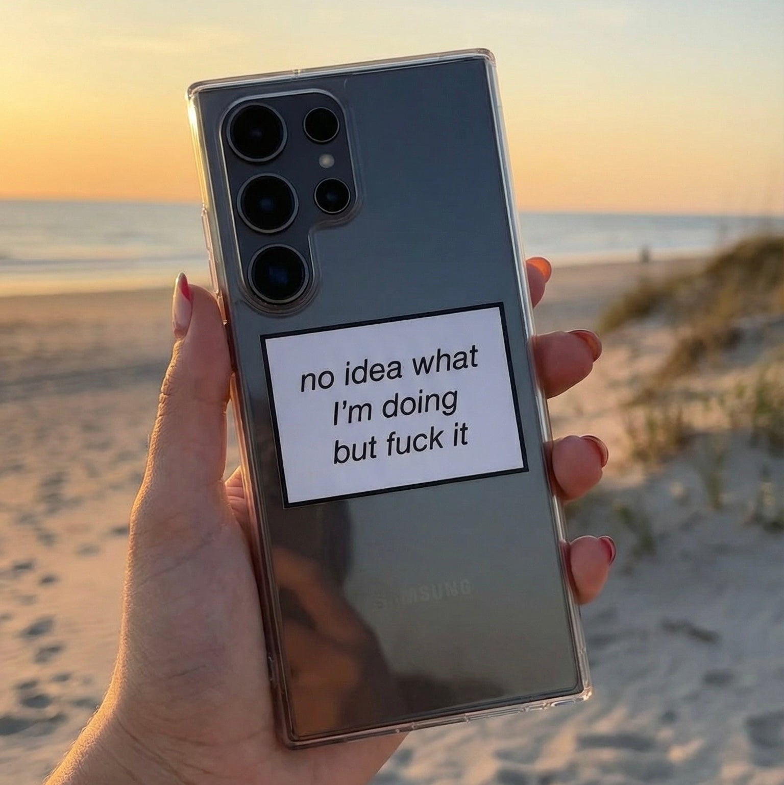 I was sticking my "no idea what I'm doing but fuck it" sticker on my phone previously but I wanted something that is more high quality and durable so I made a phone case with the same quote. I've been using this phone case every day for awhile now and honestly, I love it.